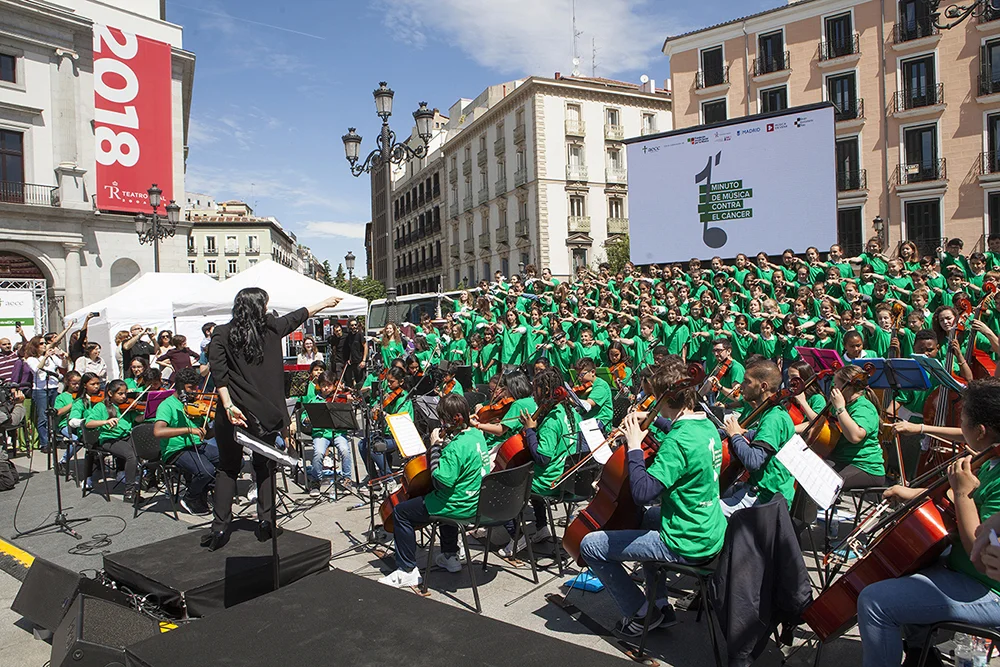 Cómo: En la Plaza de Isabel II, frente al Teatro Real, organizamos uno de esos eventos “especiales”, por el contenido del que trataba. Varios músicos e interpretes, y un coro de niños, interpretaron su versión de 1 Minuto de Música Contra el Cáncer, bajo la batuta de la directora de orquesta Silvia Sanz.